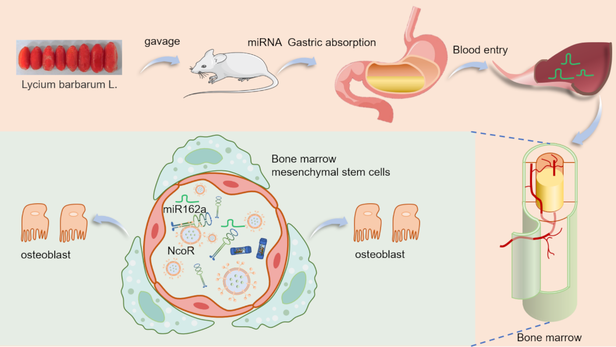 歷代醫典均記載中藥枸杞具有“補腎壯骨”的獨特功效,但現代科學研究尚未發現枸杞“補腎壯骨”獨特功效物質。該研究首次發現來源于枸杞的全新核酸類功效物質miR162a,能夠直接被哺乳動物消化道吸收并通過血液循環進入各個器官,通過“跨界調控”的形式,直接靶向哺乳動物骨髓間充質干細胞,促進骨髓間充質干細胞分化為成骨細胞,促進骨細胞生長,治療骨質疏松。該研究從現代醫學的角度闡釋枸杞補腎壯骨的科學內涵,在防治骨質疏松癥方面取得了極佳效果,驗證了中醫對骨質疏松病機的科學解釋。鑒于枸杞中miR162a的豐度相對較低,該研究還開發了轉基因本氏煙葉進行過表達miR162a,這是植物科學中應用最為廣泛的實驗模型之一。轉基因本氏煙葉不僅能實現miR162a的量產,還可以有效預防小鼠骨質疏松癥。基于產量高、成本低、環境適應性強的特性,利用轉基因植物生產miRNA實現疾病治療可能具有廣闊的應用前景和市場價值。