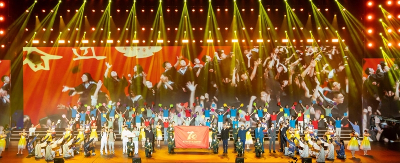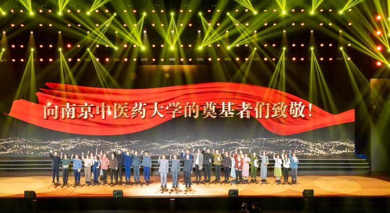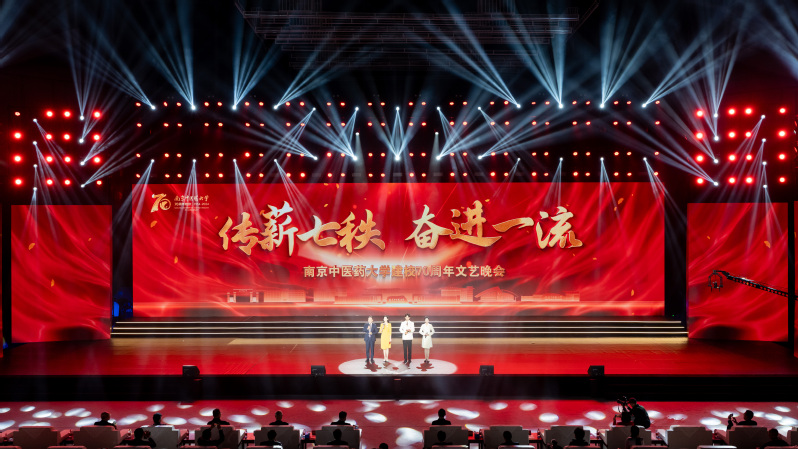 文藝晚會以“傳薪七秩 奮進一流”為主題,由校友、師生代表、離退休同志、附屬醫院和附屬藥企員工等參與演出,以原創首演節目為主,分為“杏林·織芳華”“本草·求創新”“國醫·正青春”三個篇章,全面系統回顧了我校從江蘇省中醫進修學校到南京中醫藥大學70年來櫛風沐雨、篳路藍縷、波瀾壯闊的辦學史詩,詳細講述了學校事業發展與黨和國家命脈緊密聯結、服務于國家建設需要的過程,生動彰顯了學校始終堅持“為黨育人、為國育才”的光榮使命,不斷傳承創新發展中醫藥事業的價值追求。晚會不僅是一場舞美震撼、精彩絕倫的校史文化盛宴,更是一堂飽含深情、直擊心靈的思政大課。