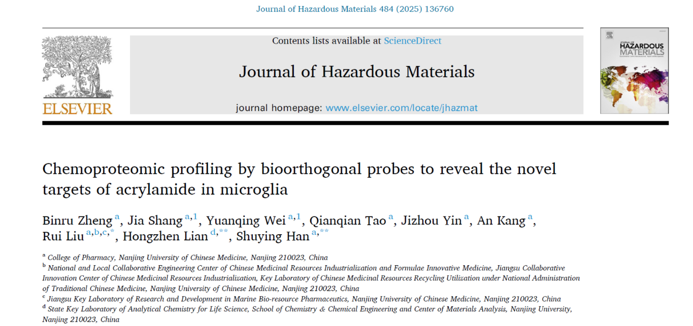 南京中醫藥大學藥學院韓疏影副教授、劉睿教授團隊聯合南京大學練鴻振教授在知名學術期刊Journal of Hazardous Materials(中科院一區,IF: 12.2)在線發表題為“Chemoproteomic profiling by bioorthogonal probes to reveal the novel targets of acrylamide in microglia”的最新研究成果。