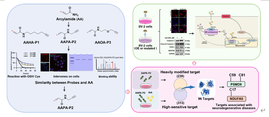 近年來,暴露于丙烯酰胺(AA)引起的神經毒性研究受到廣泛關注,但因對AA靶蛋白了解有限,其神經毒性作用機制尚未闡明。本研究設計并合成了一種結構類似于AA的生物正交探針,結合化學蛋白組學技術,在小鼠小膠質細胞(BV-2)中捕獲并鑒定了754個AA共價修飾的蛋白,并對進一步篩選出的潛在關鍵靶點和結合位點進行了驗證。研究發現,AA可通過與PSMD9蛋白上Cys59與NDUFA5蛋白上Cys17共價結合,串擾泛素-蛋白酶體系統與線粒體呼吸鏈,從而誘發神經元凋亡。本研究為確定丙烯酰胺的共價結合靶標提供了一種有效的生物正交探針工具,并為了解丙烯酰胺誘導神經毒性的分子機制及中藥干預治療AA相關神經損傷的潛在治療靶點提供了新的視角。