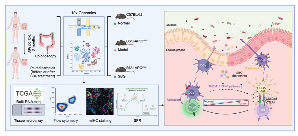 南京中醫藥大學程海波教授團隊,聯合南京大學孫洋教授團隊、江蘇省中醫院凌亭生教授團隊近日Acta Pharmaceutica Sinica B(中科院一區,IF:14.7)期刊上發表題為“Single-Cell RNA Sequencing Reveals Shen-Bai-Jie-Du Decoction Retards Colorectal Tumorigenesis by Regulating the TMEM131-TNF Signaling Pathway Mediated Differentiation of Immunosuppressive Dendritic Cells”的最新研究成果,揭示參白解毒方可通過調節TMEM131-TNF信號通路介導的免疫抑制樹突狀細胞分化進而阻止結直腸腺瘤癌變。