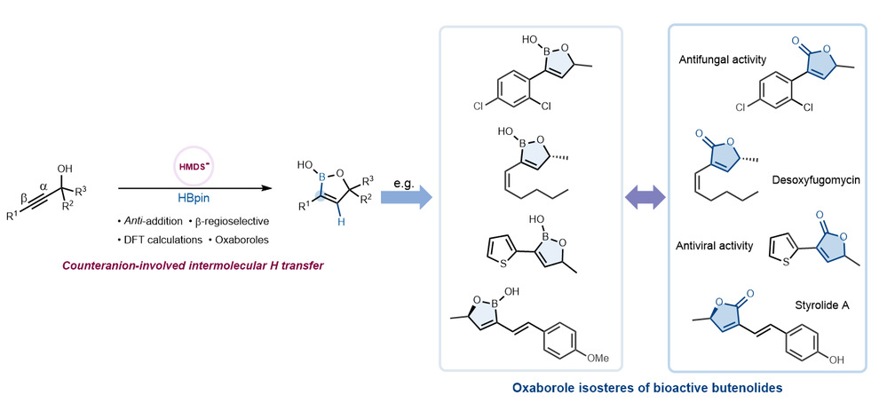 硼砂作為一種中藥材具有抗菌、消炎和抗腫瘤的功效。此外硼元素在硼中子俘獲治療中也發揮重要作用。金弘明教授團隊通過發展炔烴反式硼氫化策略,高效構建了一類丁烯酸內脂的含硼生物電子等排體,通過對原先生物活性分子中羰基的電子等排替換,為含硼藥物分子的設計開發提供了新的思路。